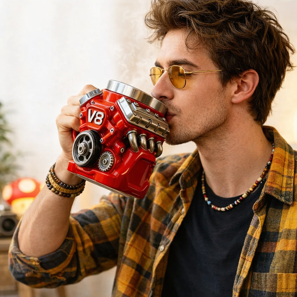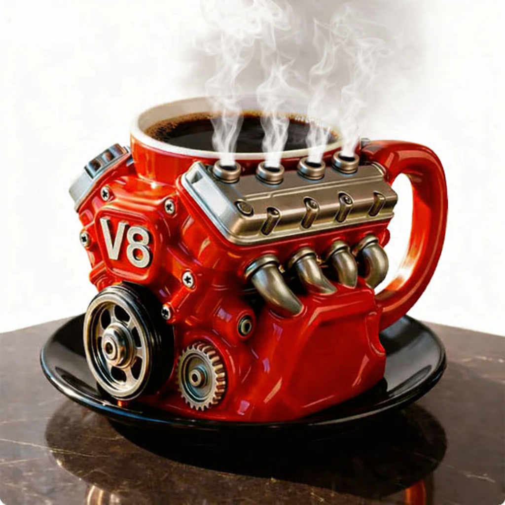 El diseño inspirado en un motor V8 y el efecto de vapor convierten una simple pausa para el café en una experiencia visual única.